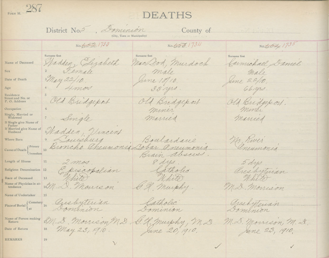 Death Registration: Year: 1910 book: 3 page: 287 number: 1733