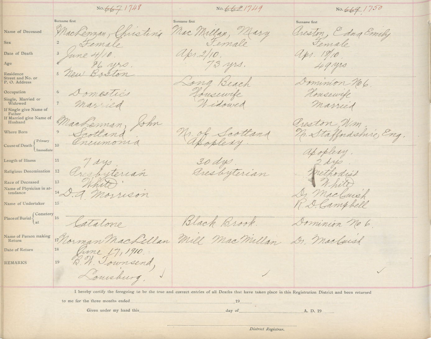 Death Registration: Year: 1910 book: 3 page: 289 number: 1750