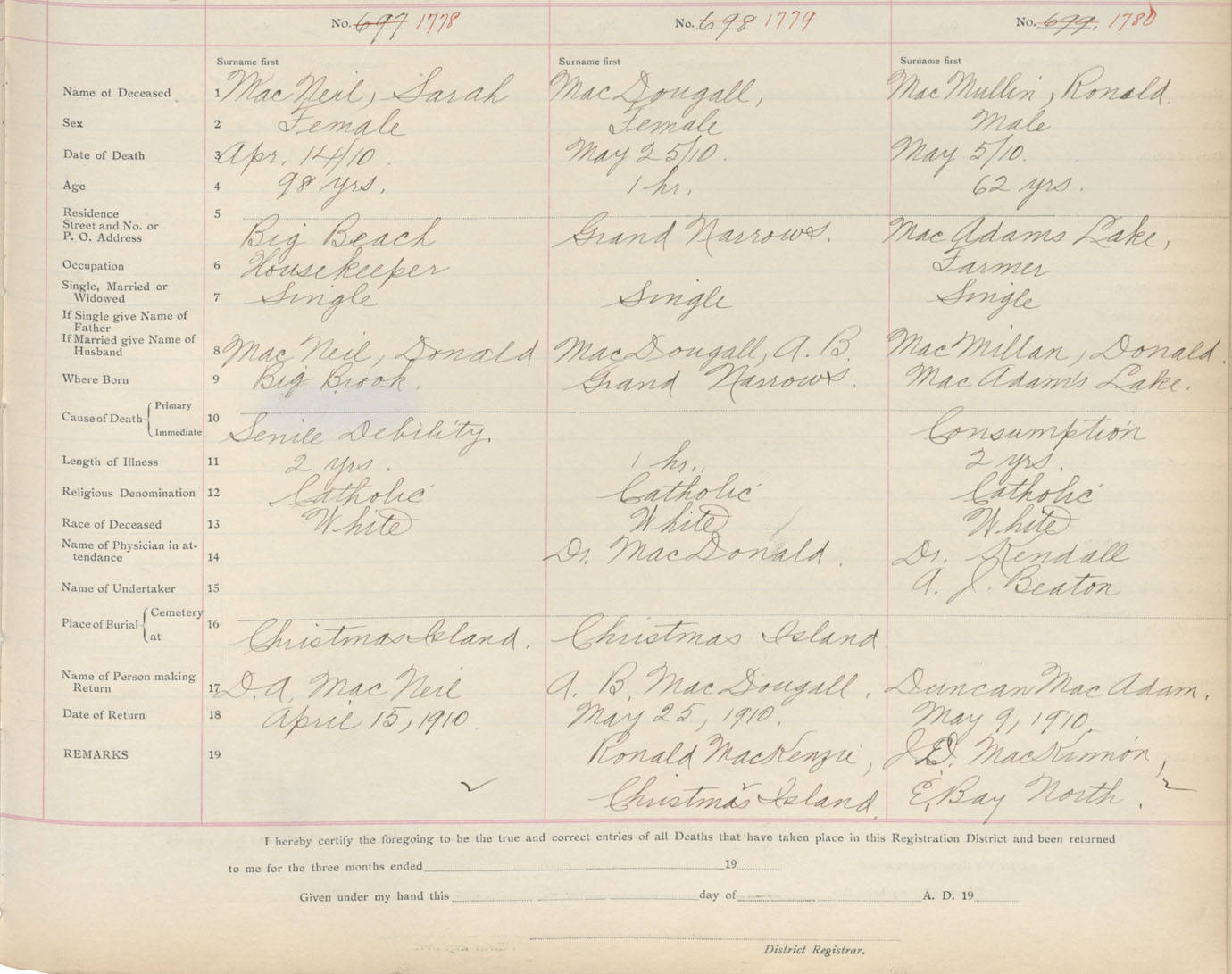 Death Registration: Year: 1910 book: 3 page: 294 number: 1780