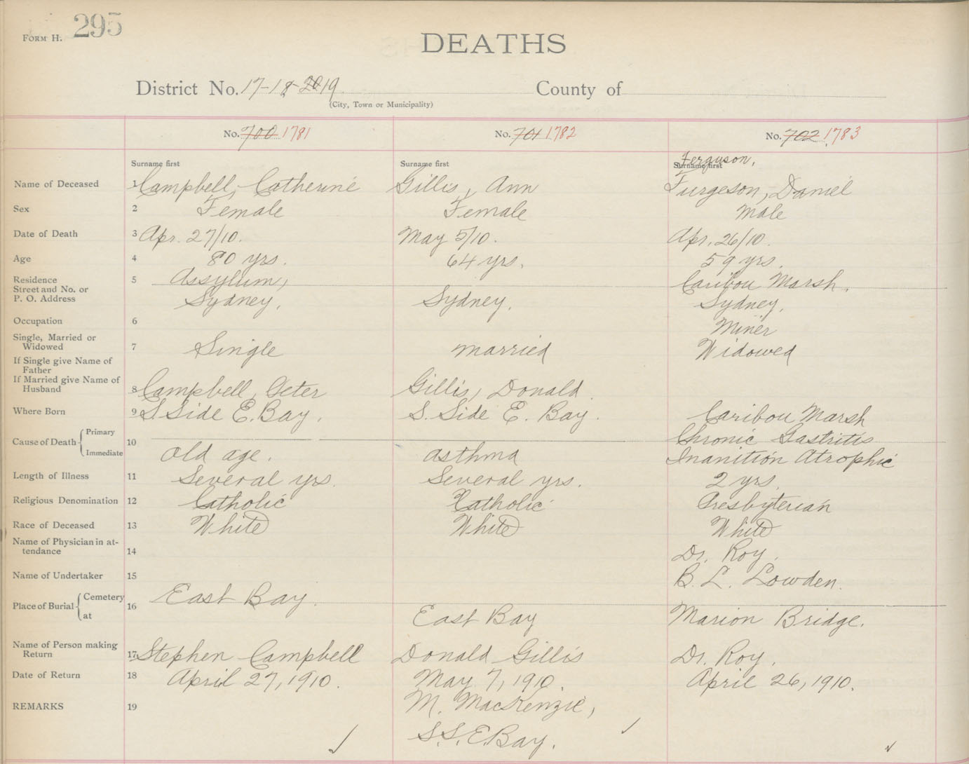 Death Registration: Year: 1910 book: 3 page: 295 number: 1783