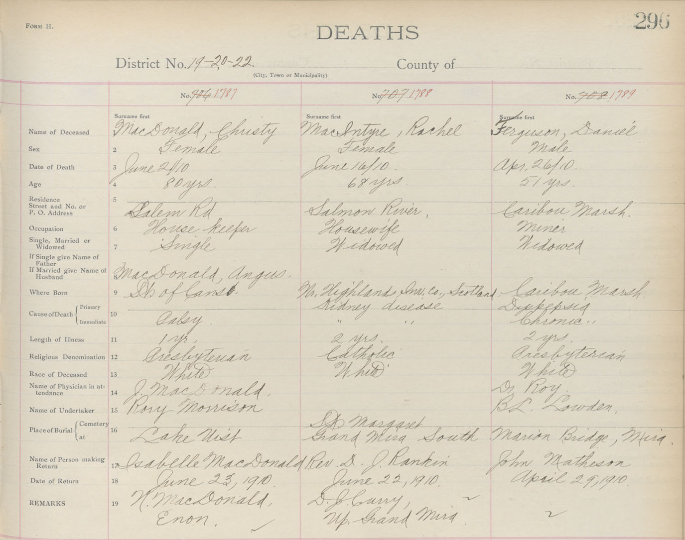 Death Registration: Year: 1910 book: 3 page: 296 number: 1787