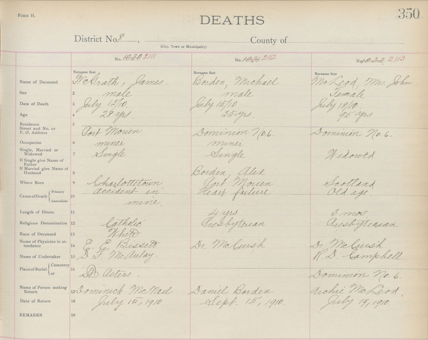 Death Registration: Year: 1910 book: 3 page: 350 number: 2113