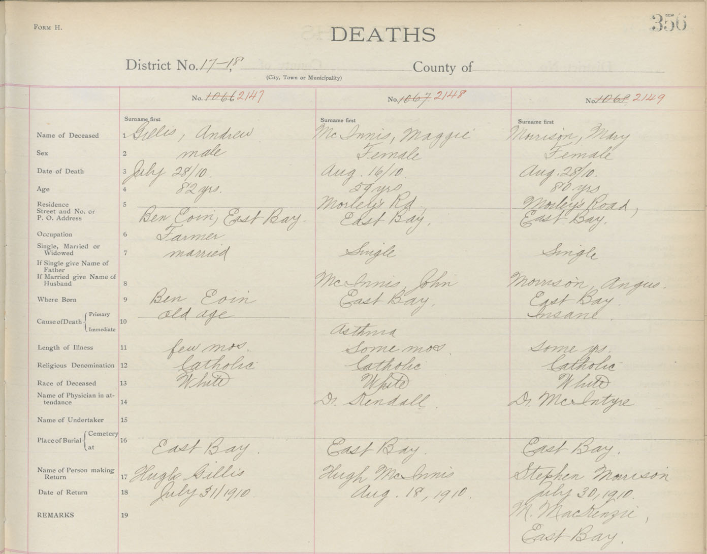 Death Registration: Year: 1910 book: 3 page: 356 number: 2147