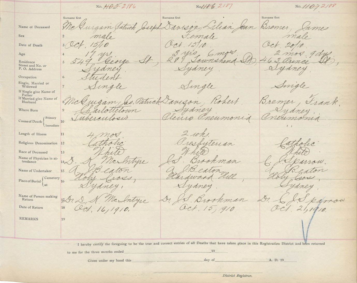 Death Registration: Year: 1910 book: 3 page: 362 number: 2186