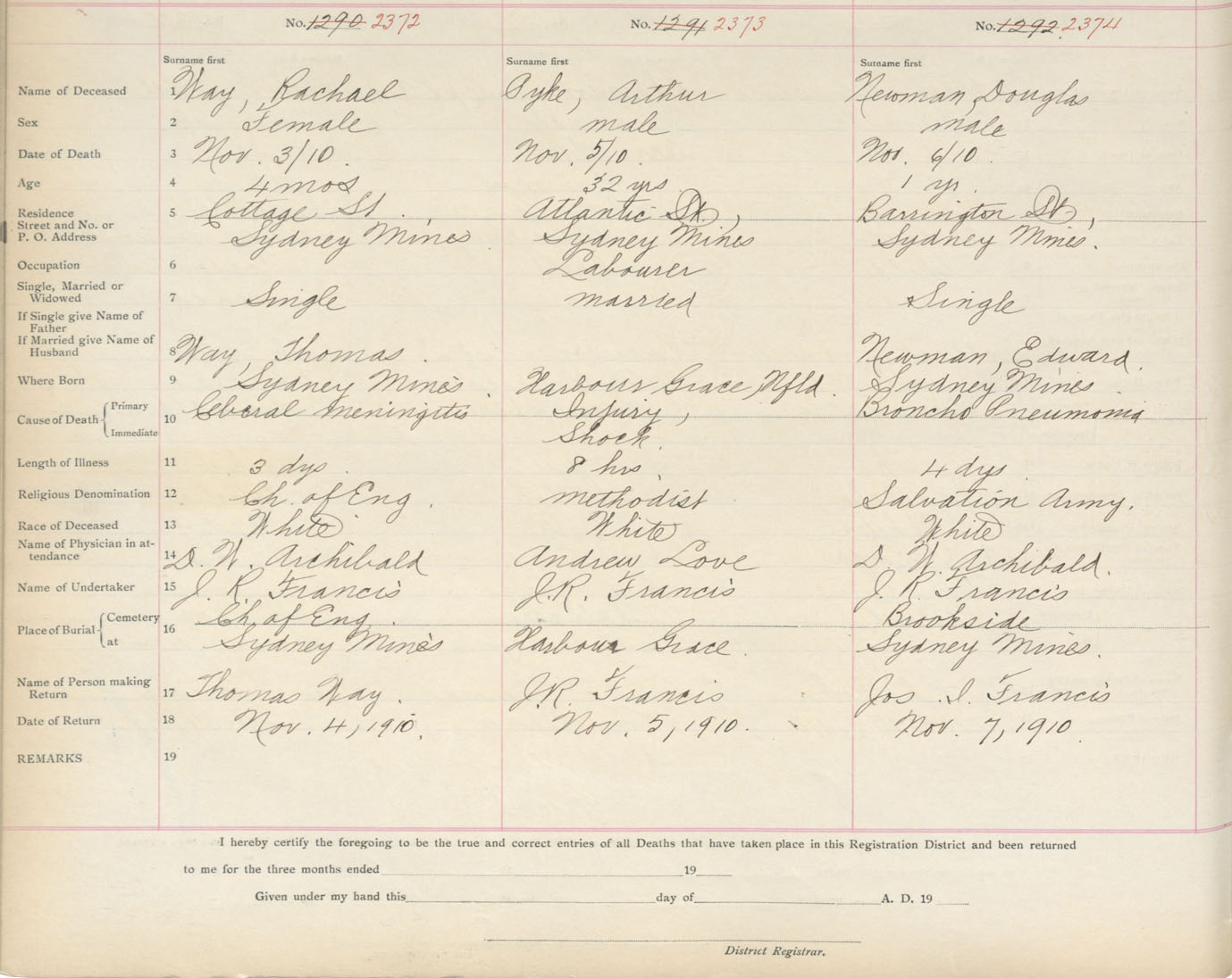 Death Registration: Year: 1910 book: 3 page: 393 number: 2374
