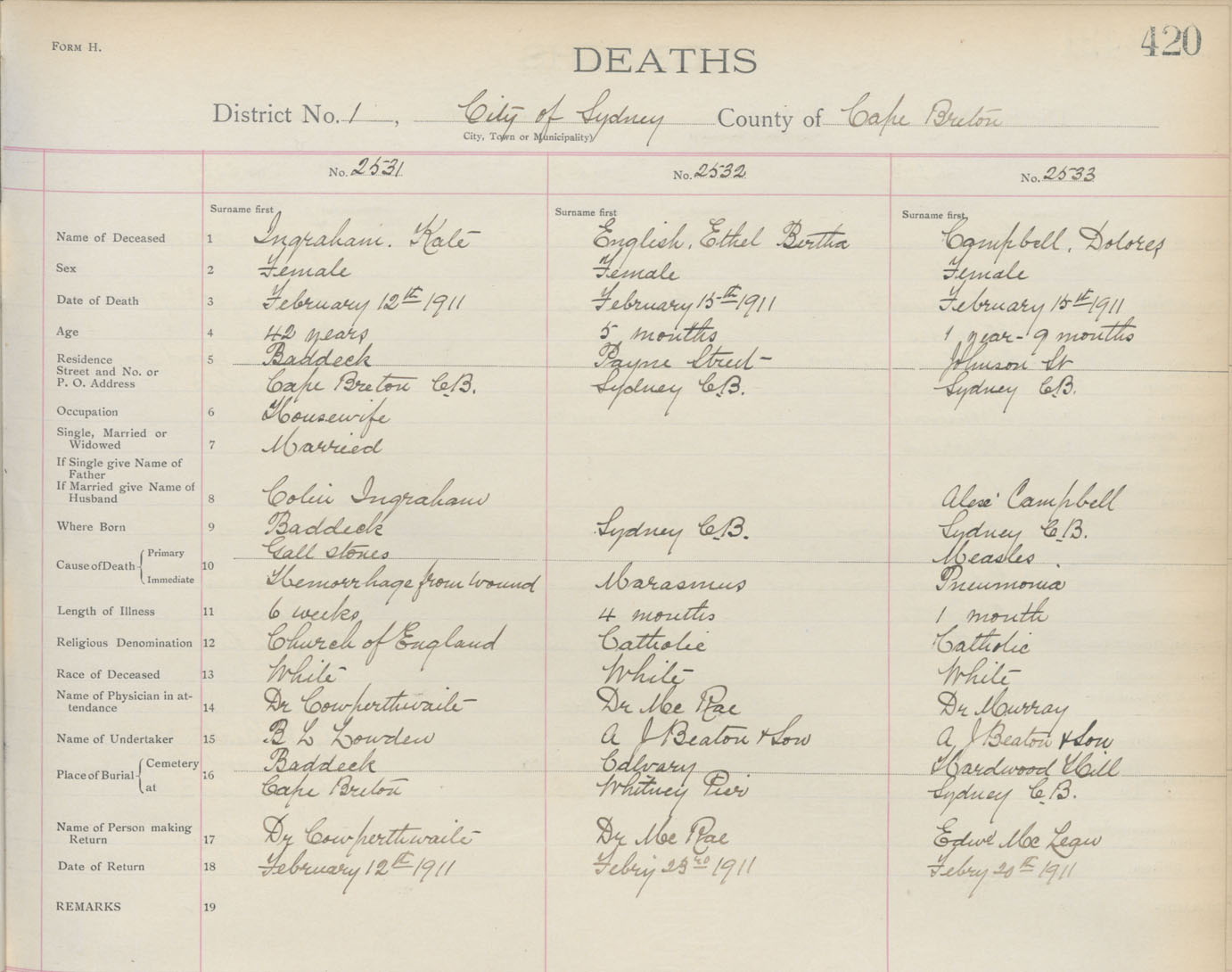 Death Registration: Year: 1911 book: 3 page: 420 number: 2533