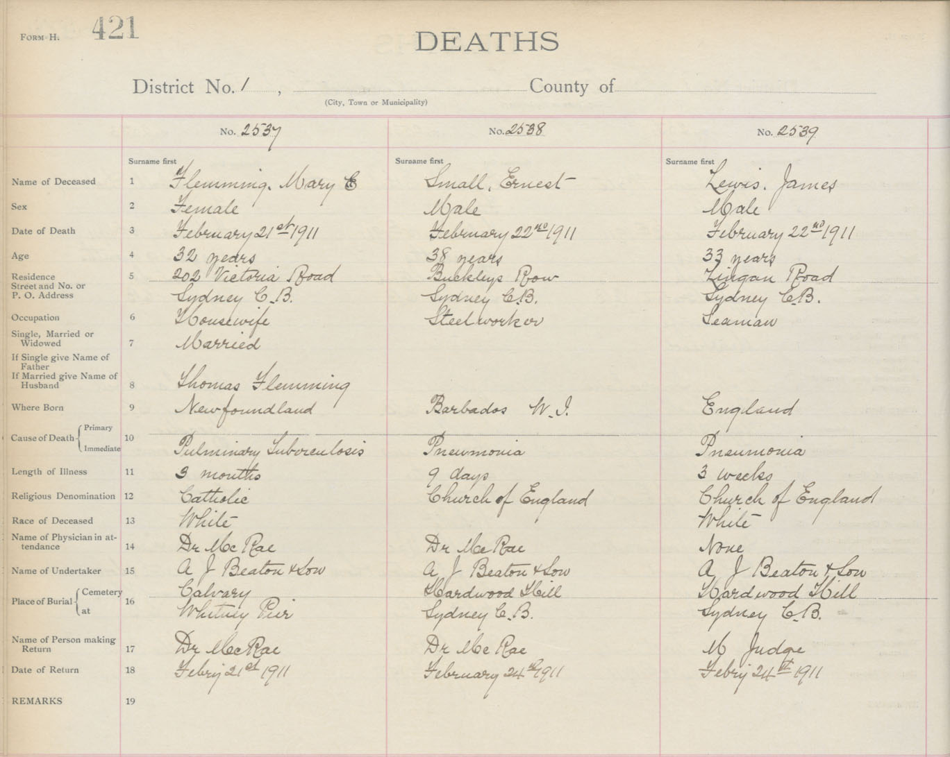 Death Registration: Year: 1911 book: 3 page: 421 number: 2539