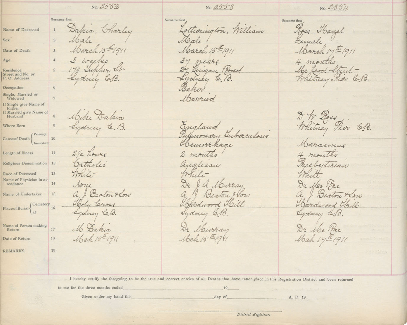 Death Registration: Year: 1911 book: 3 page: 423 number: 2552