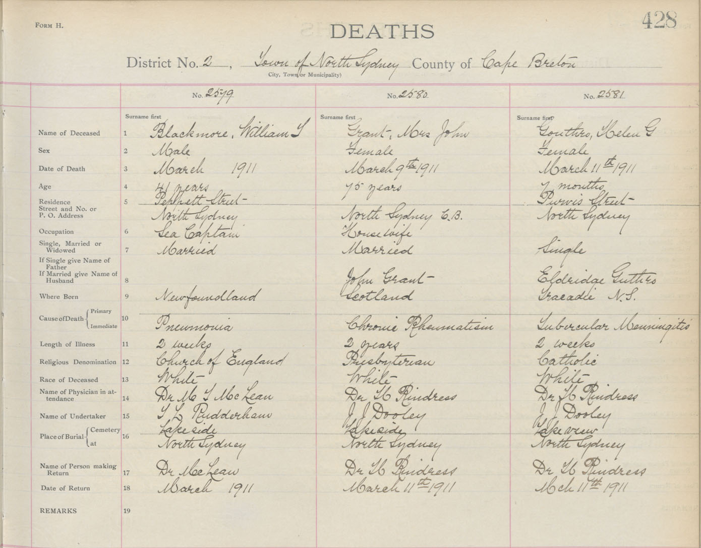 Death Registration: Year: 1911 book: 3 page: 428 number: 2579