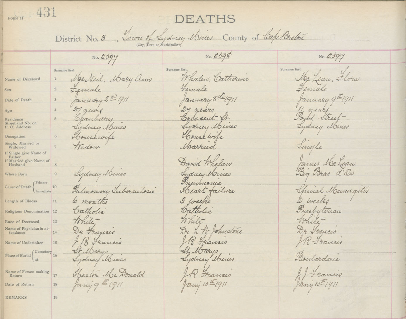 Death Registration: Year: 1911 book: 3 page: 431 number: 2597