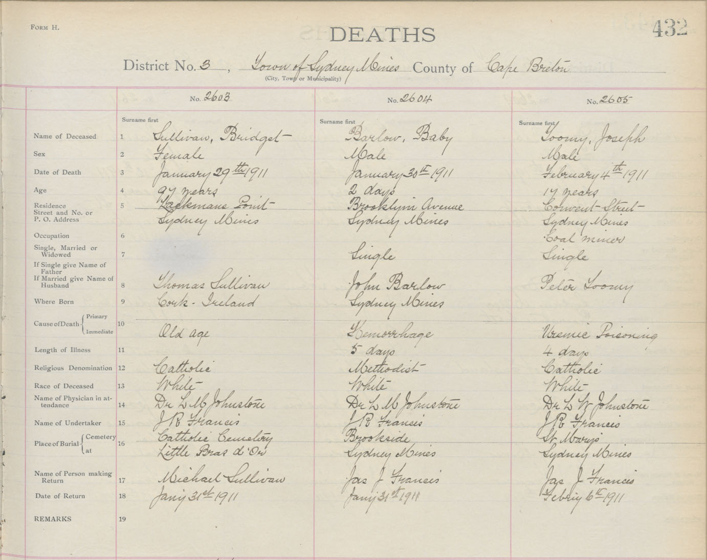 Death Registration: Year: 1911 book: 3 page: 432 number: 2603