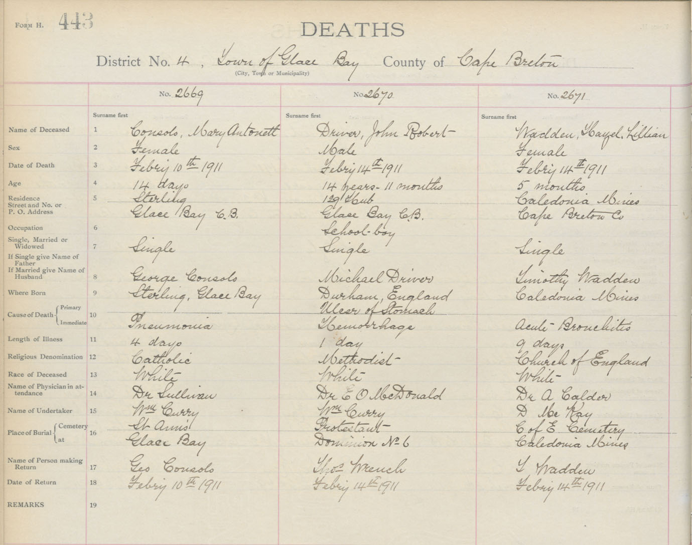 Death Registration: Year: 1911 book: 3 page: 443 number: 2671