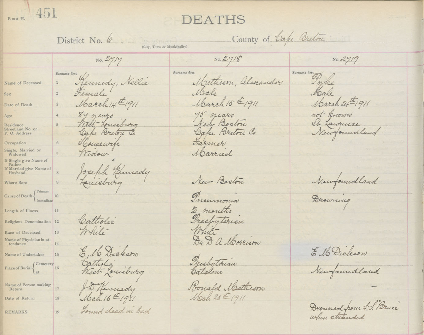 Male Death Registration: Year: 1911 book: 3 page: 451 number: 2719