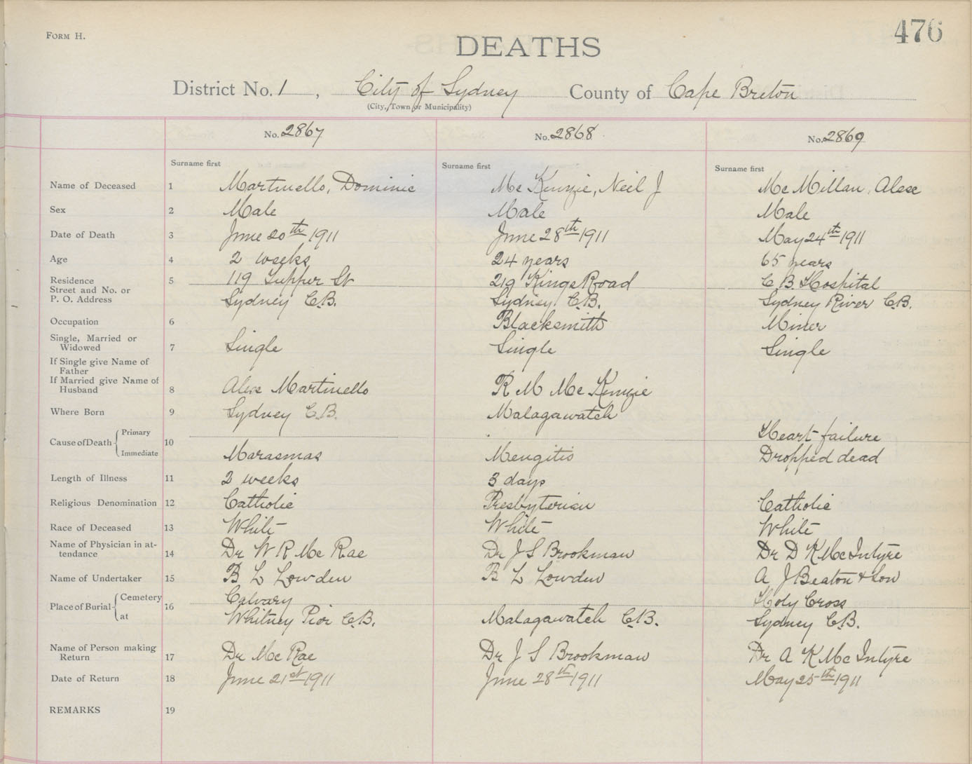 Death Registration: Year: 1911 book: 3 page: 476 number: 2869