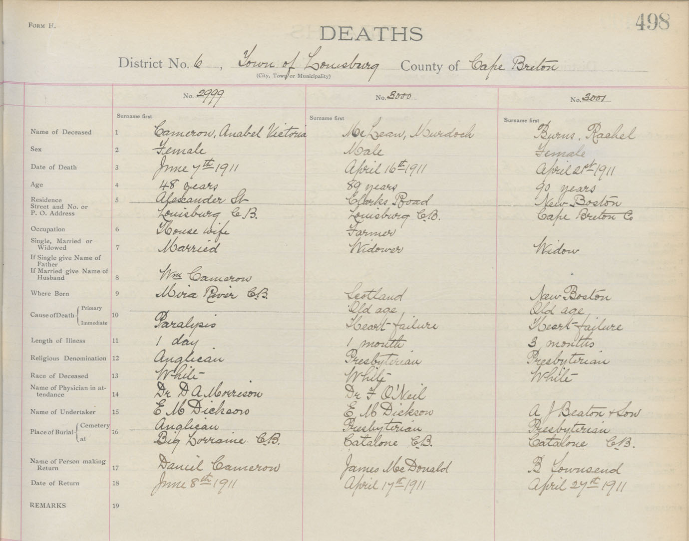 Death Registration: Year: 1911 book: 3 page: 498 number: 3001