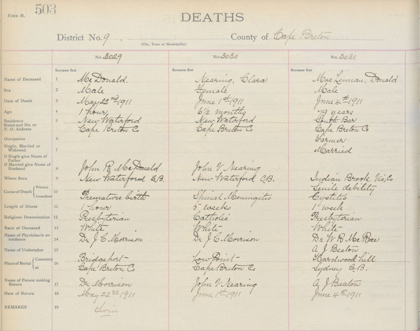 Death Registration: Year: 1911 book: 3 page: 503 number: 3031
