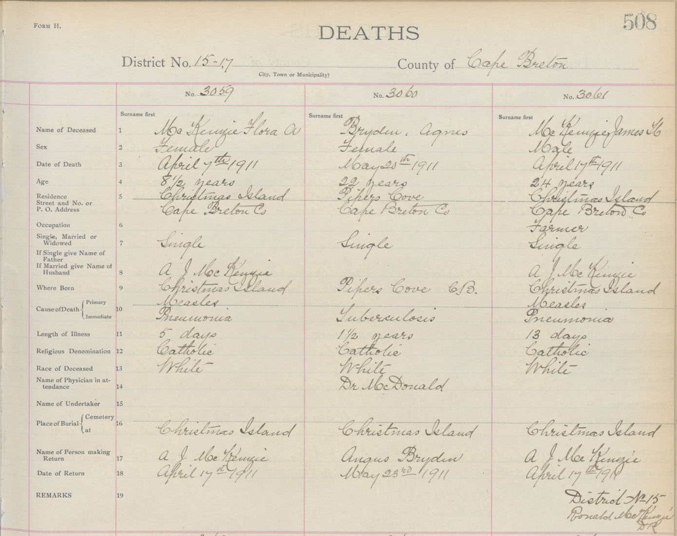 Death Registration: Year: 1911 book: 3 page: 508 number: 3061
