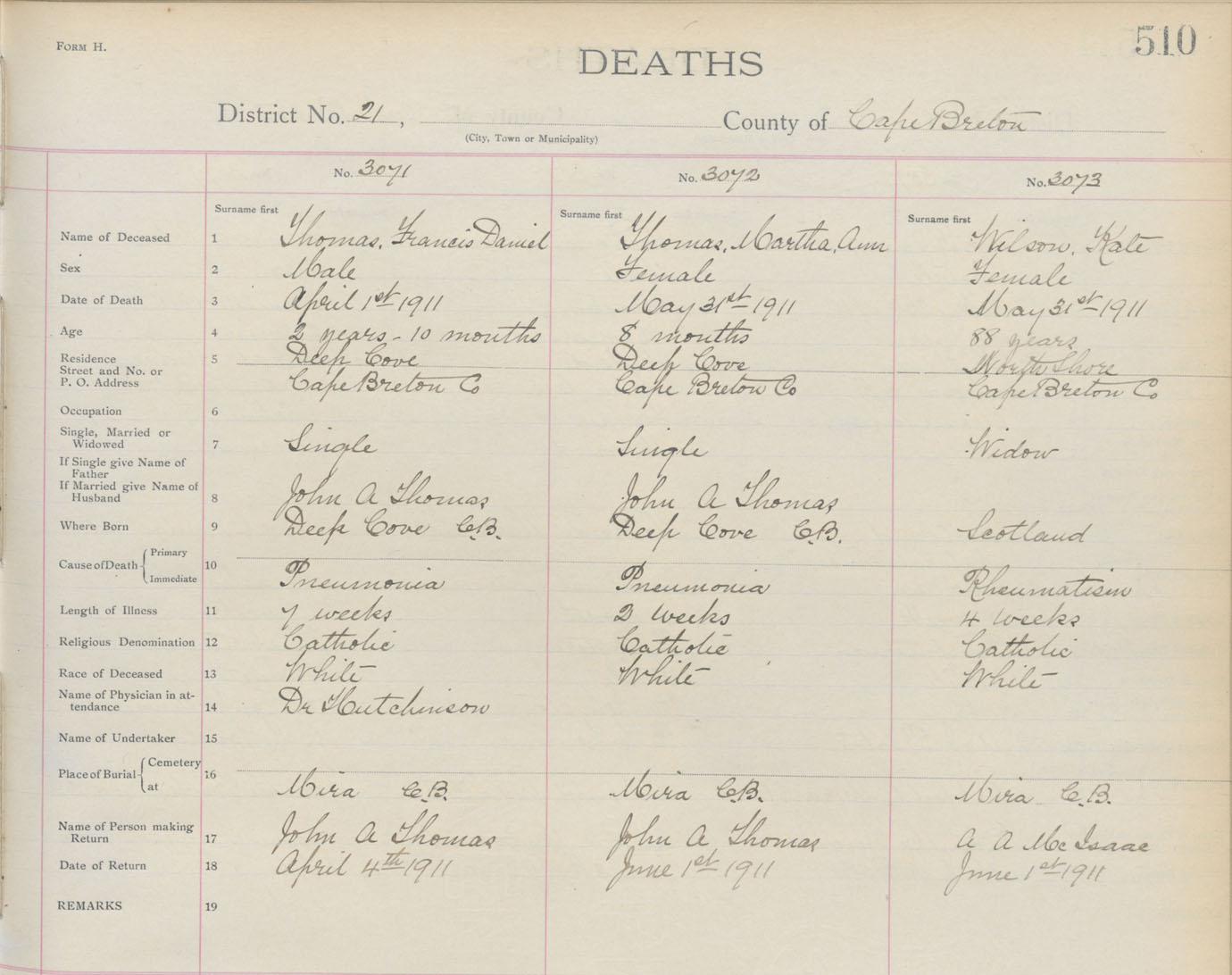 Death Registration: Year: 1911 book: 3 page: 510 number: 3071