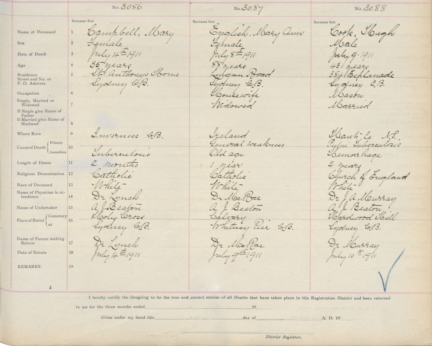 Death Registration: Year: 1911 book: 3 page: 512 number: 3086