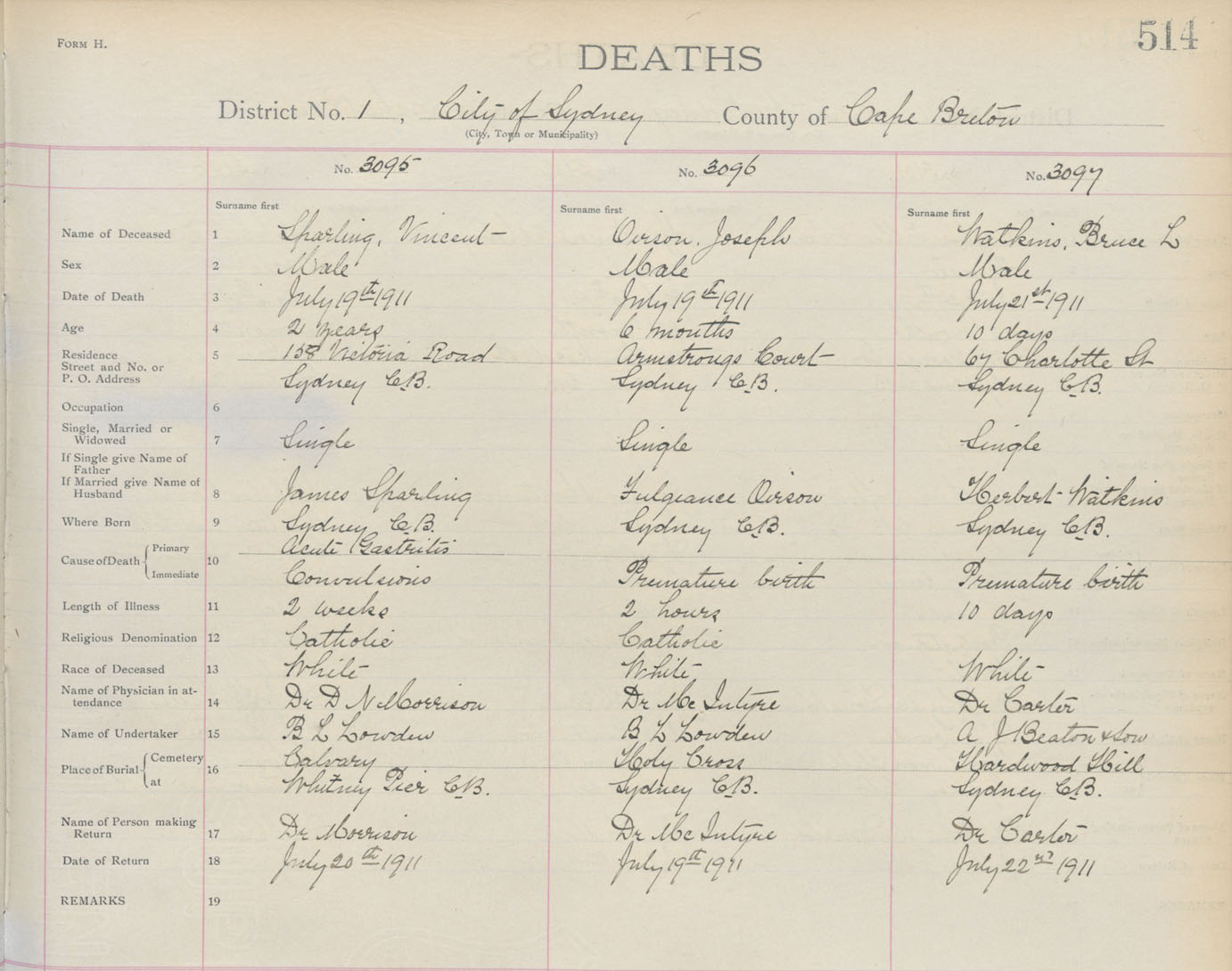 Death Registration: Year: 1911 book: 3 page: 514 number: 3095