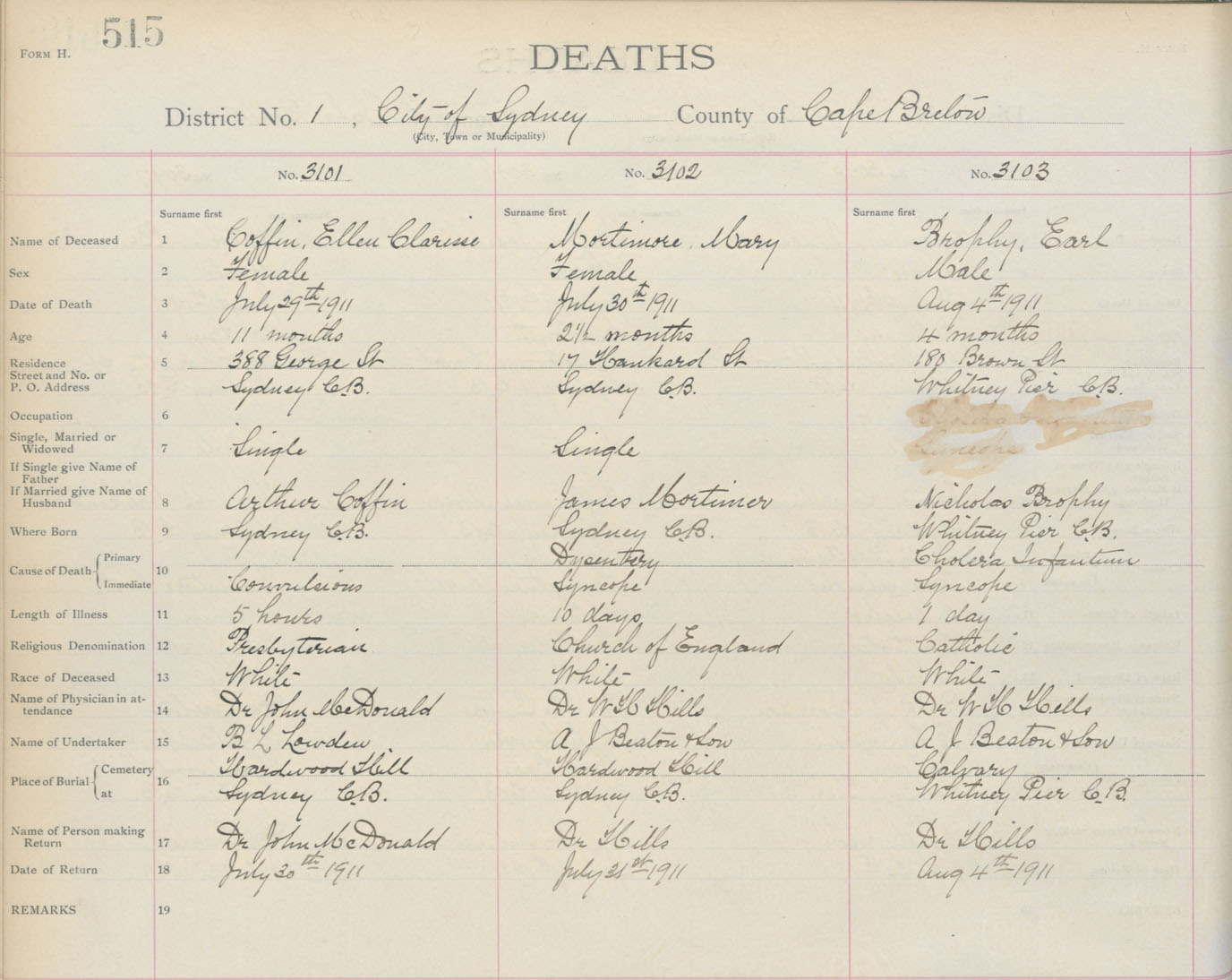 Death Registration: Year: 1911 book: 3 page: 515 number: 3101