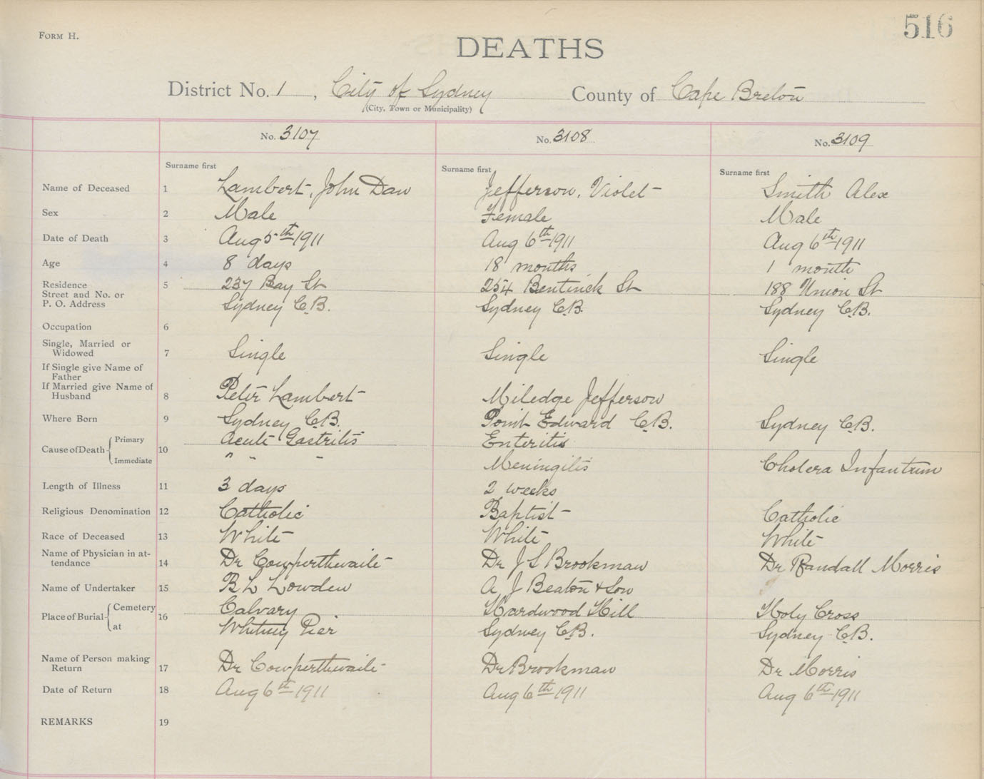 Death Registration: Year: 1911 book: 3 page: 516 number: 3107