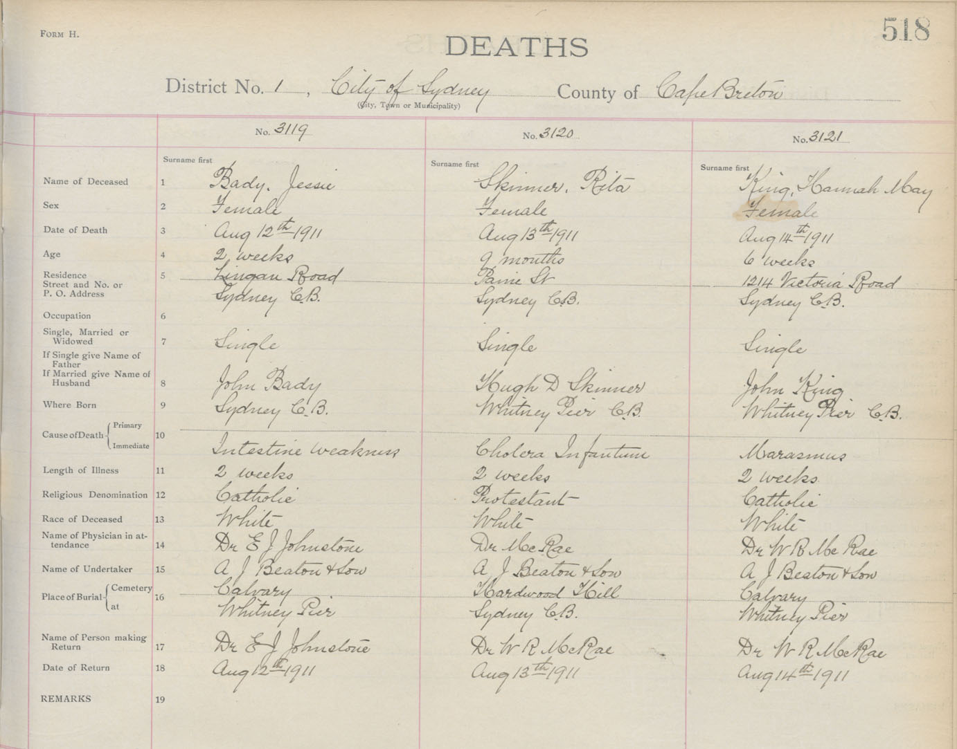 Death Registration: Year: 1911 book: 3 page: 518 number: 3119