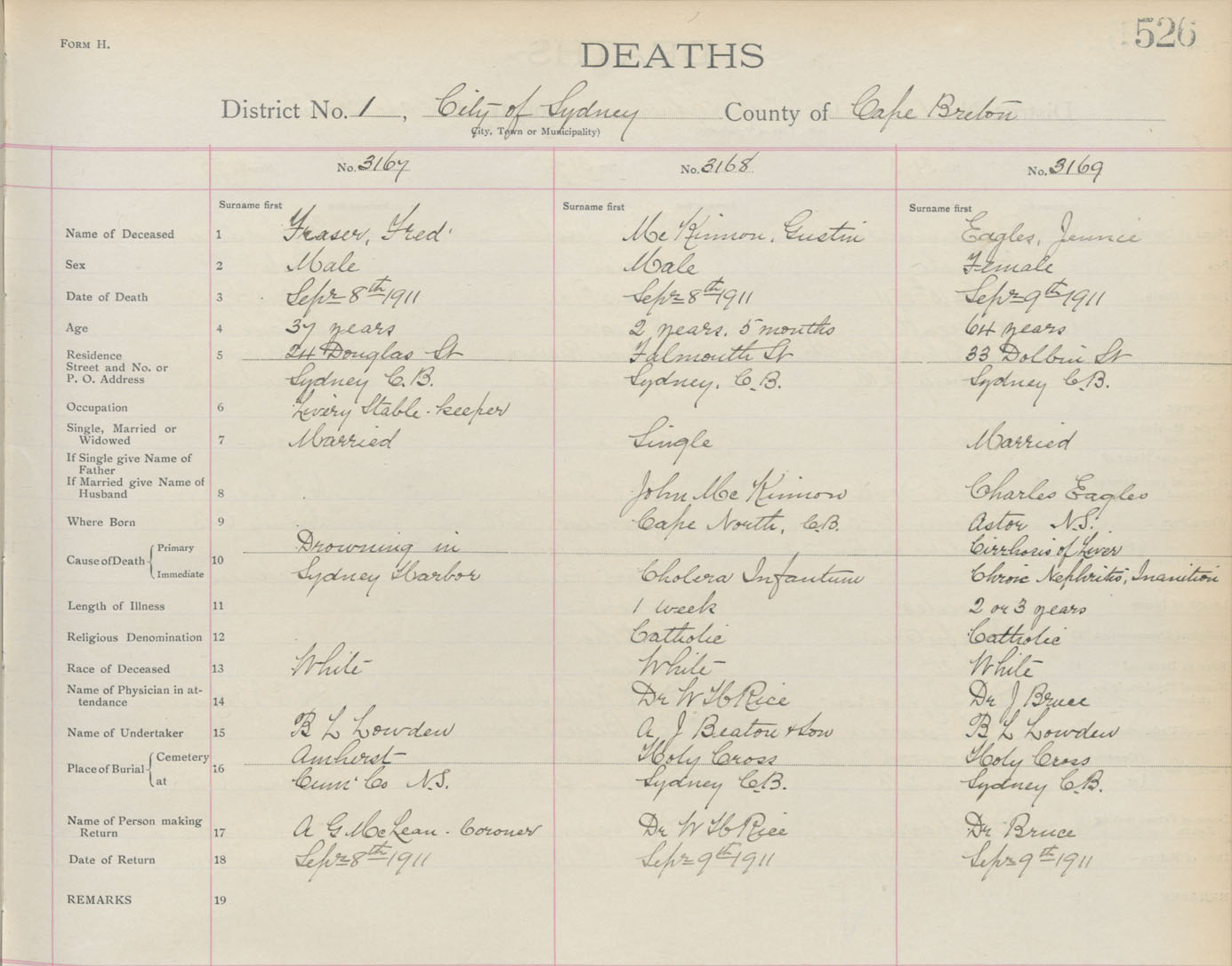 Death Registration: Year: 1911 book: 3 page: 526 number: 3167