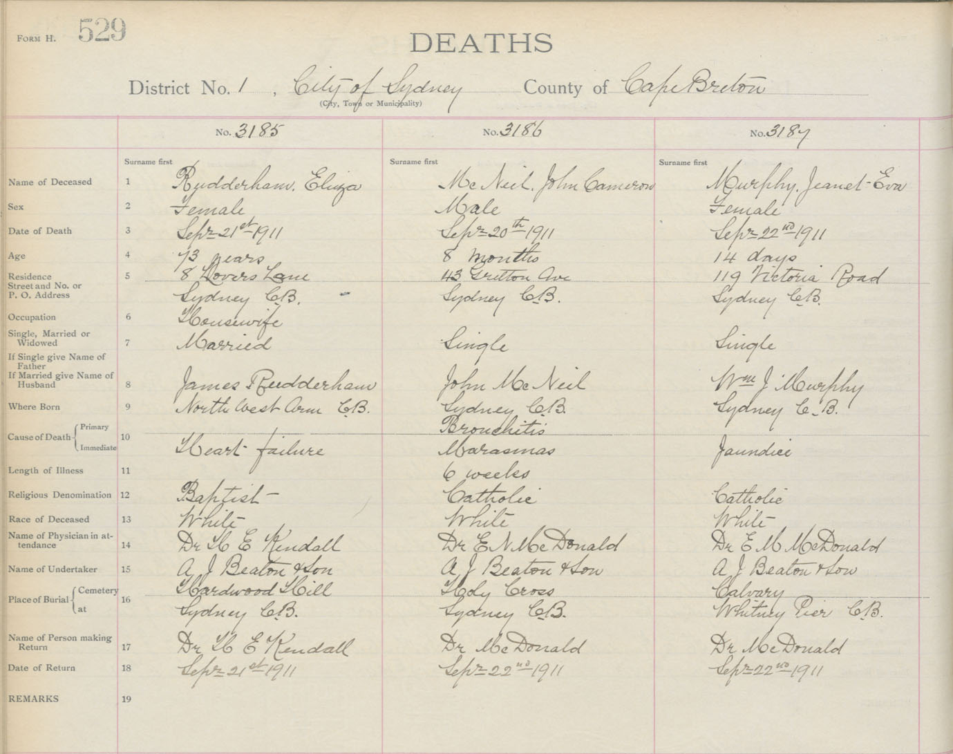 Death Registration: Year: 1911 book: 3 page: 529 number: 3185