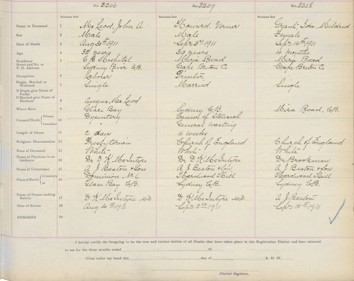 Death Registration: Year: 1911 book: 3 page: 532 number: 3206