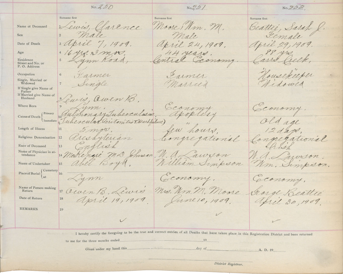 Death Registration: Year: 1909 book: 4 page: 42 number: 252