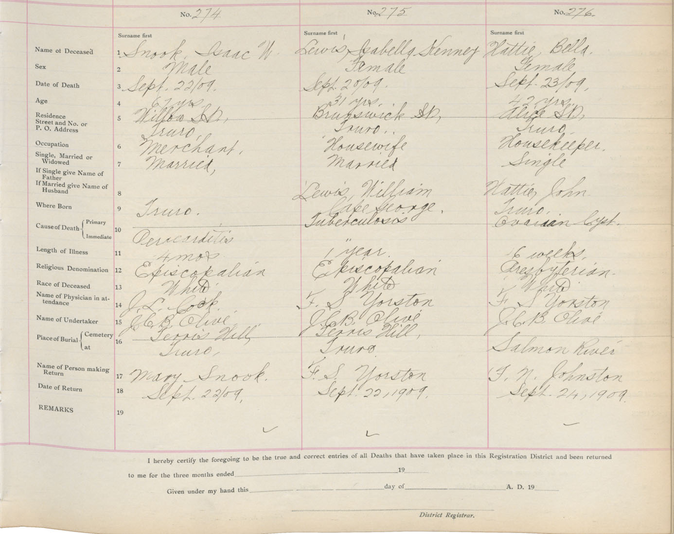 Death Registration: Year: 1909 book: 4 page: 46 number: 276