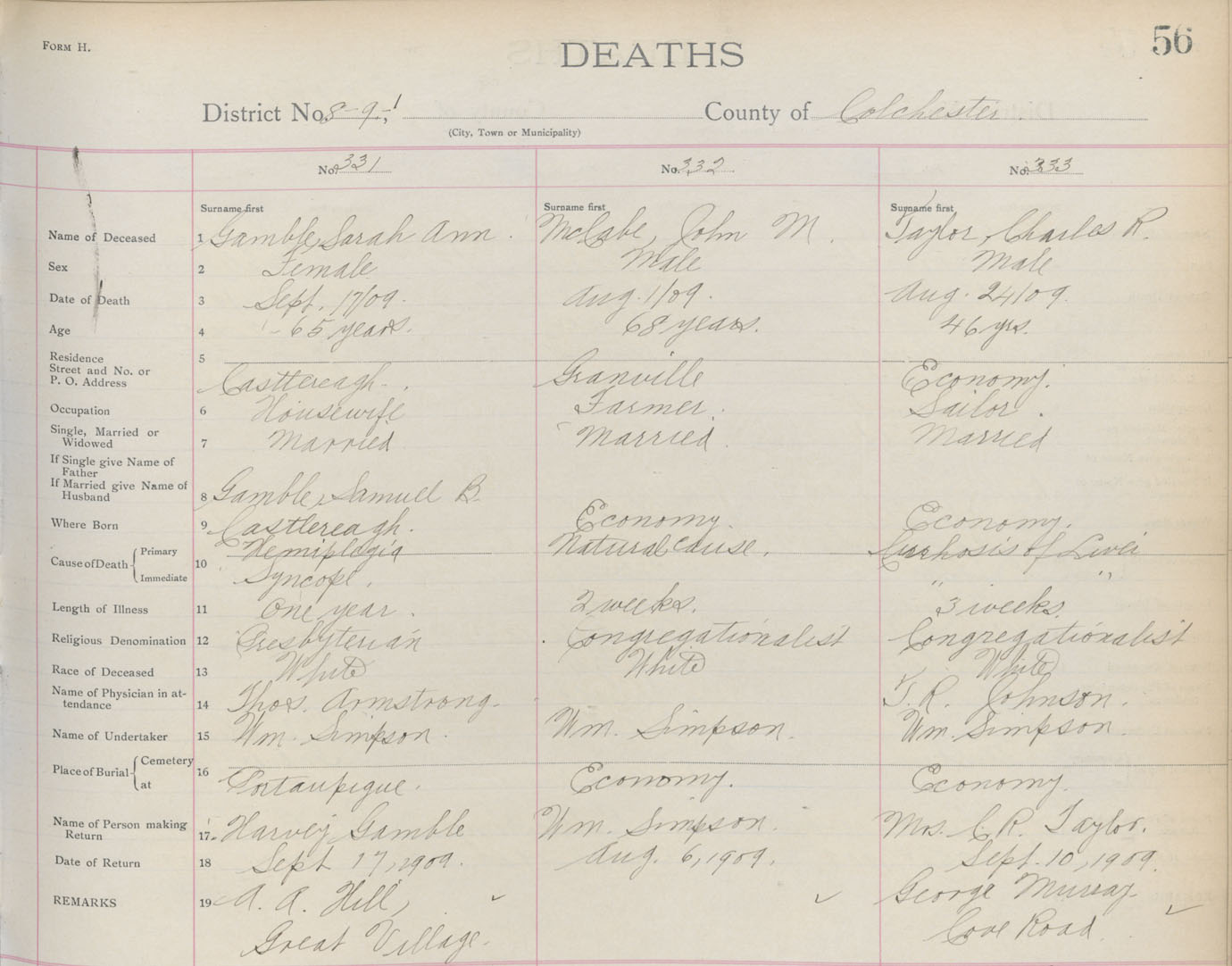 Death Registration: Year: 1909 book: 4 page: 56 number: 333