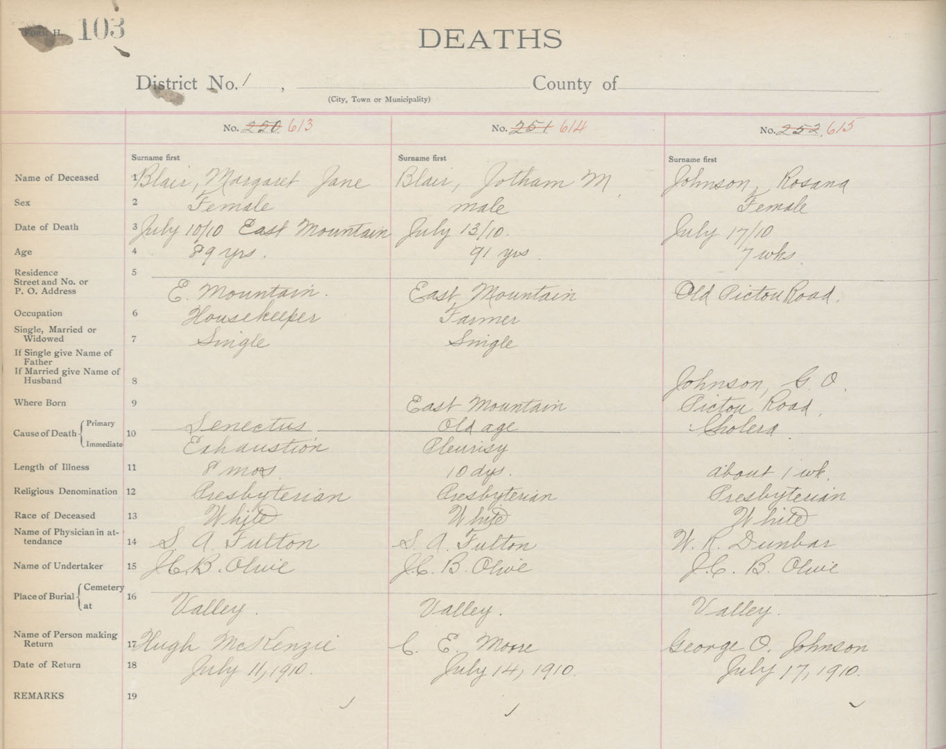 Death Registration: Year: 1910 book: 4 page: 103 number: 613
