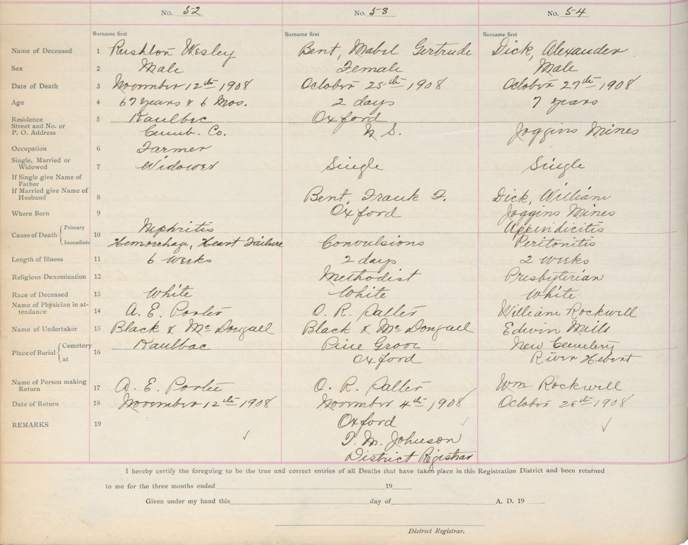 Death Registration: Year: 1908 book: 5 page: 9 number: 52