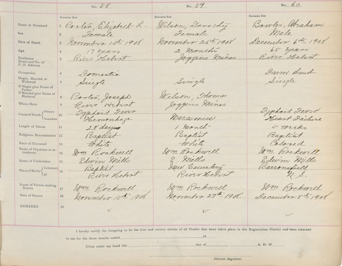 Death Registration: Year: 1908 book: 5 page: 10 number: 58