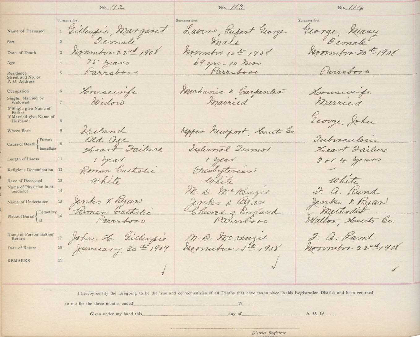Death Registration: Year: 1908 book: 5 page: 19 number: 114