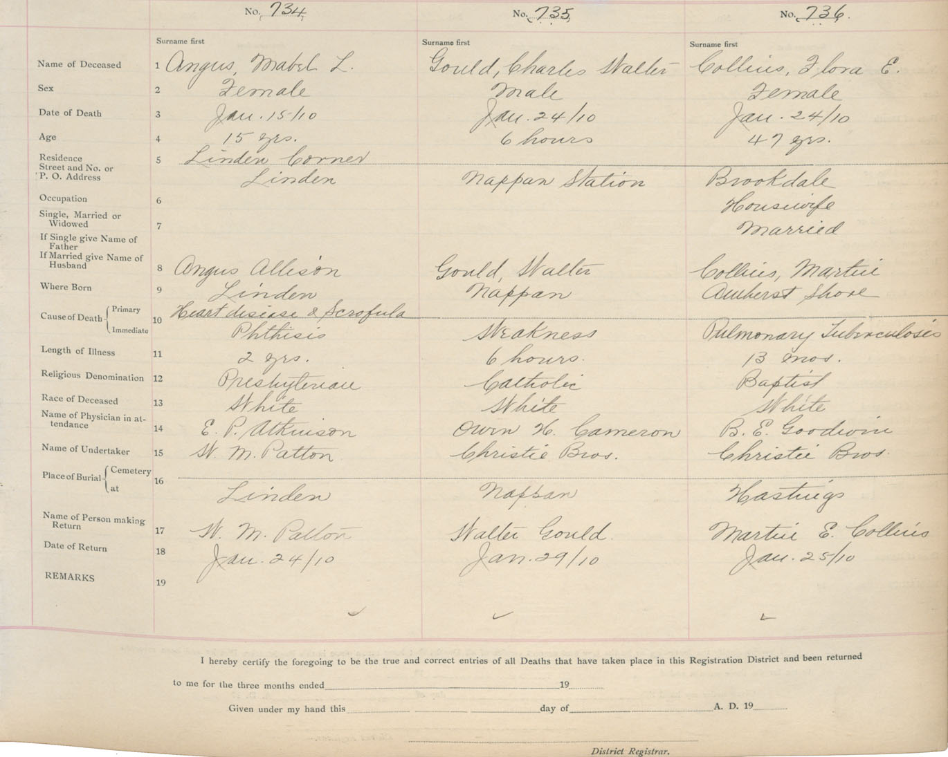 Death Registration: Year: 1910 book: 5 page: 122 number: 734