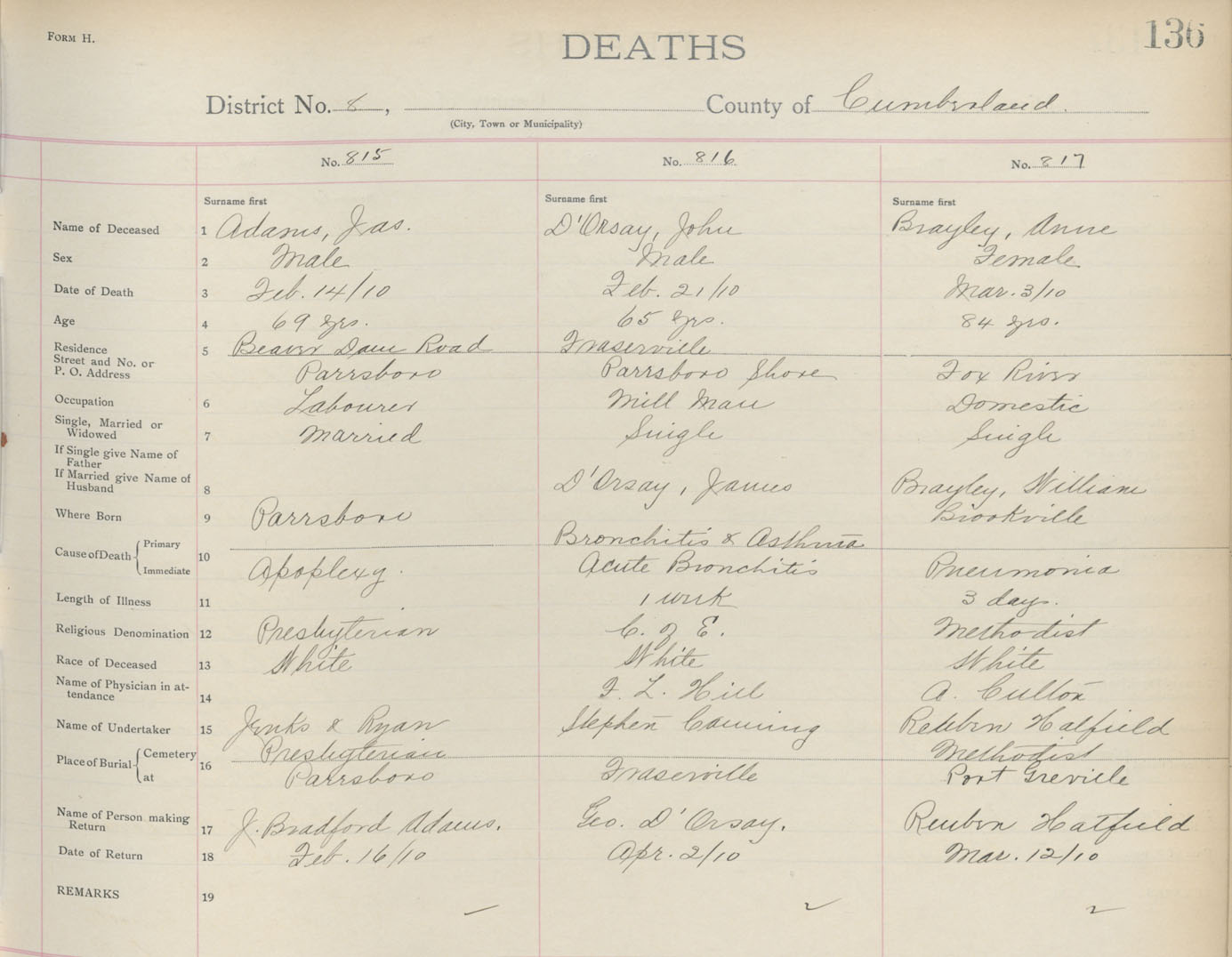 Death Registration: Year: 1910 book: 5 page: 136 number: 815