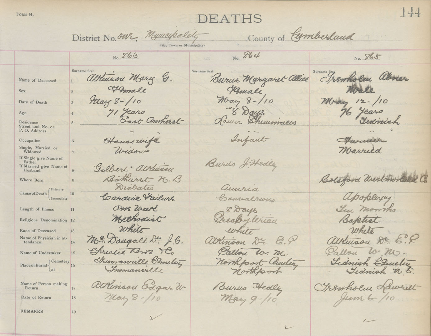 Death Registration: Year: 1910 book: 5 page: 144 number: 863