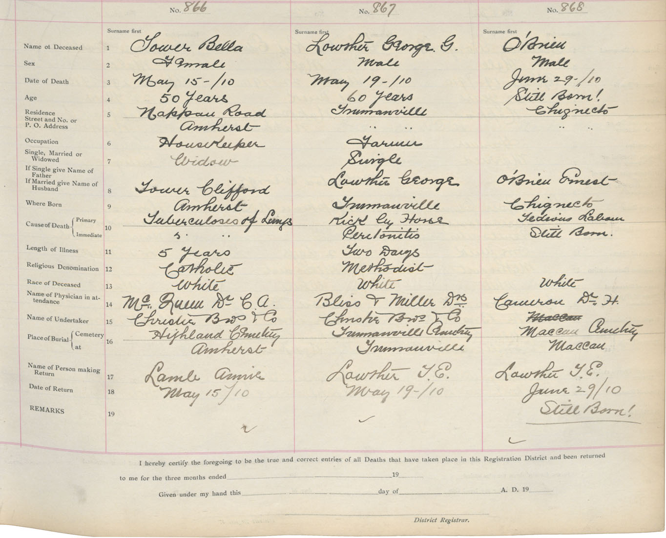 Death Registration: Year: 1910 book: 5 page: 144 number: 866