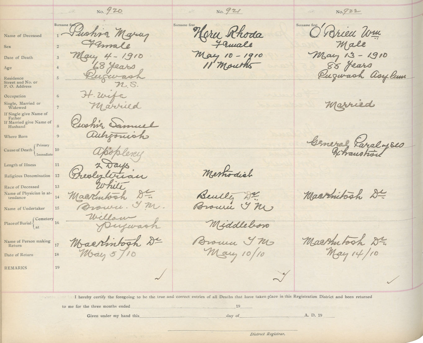 Death Registration: Year: 1910 book: 5 page: 153 number: 920