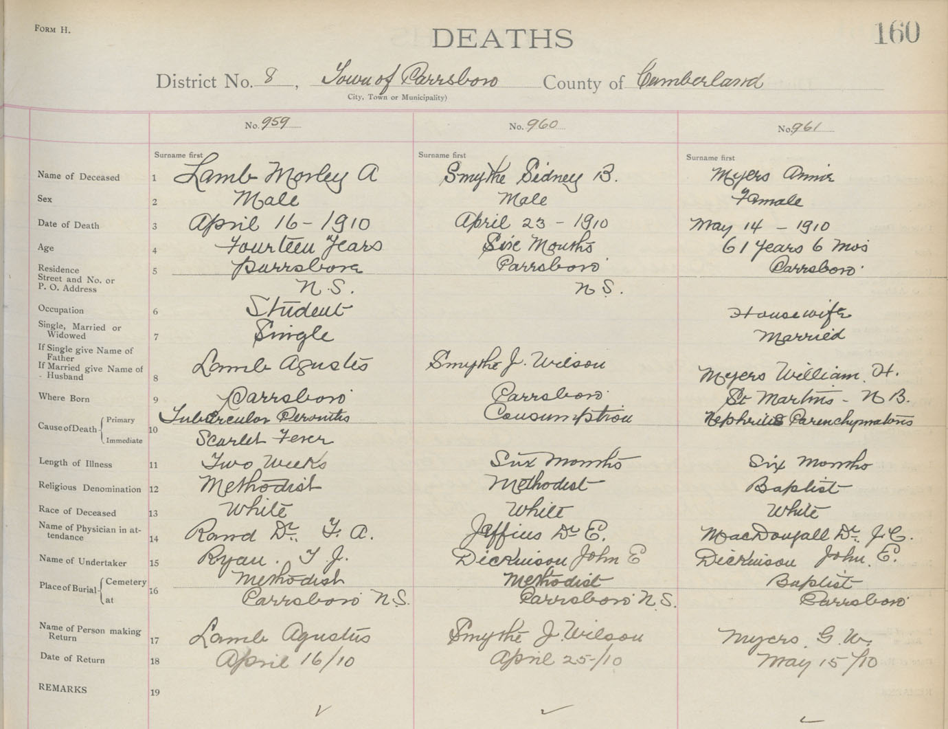 Death Registration: Year: 1910 book: 5 page: 160 number: 959