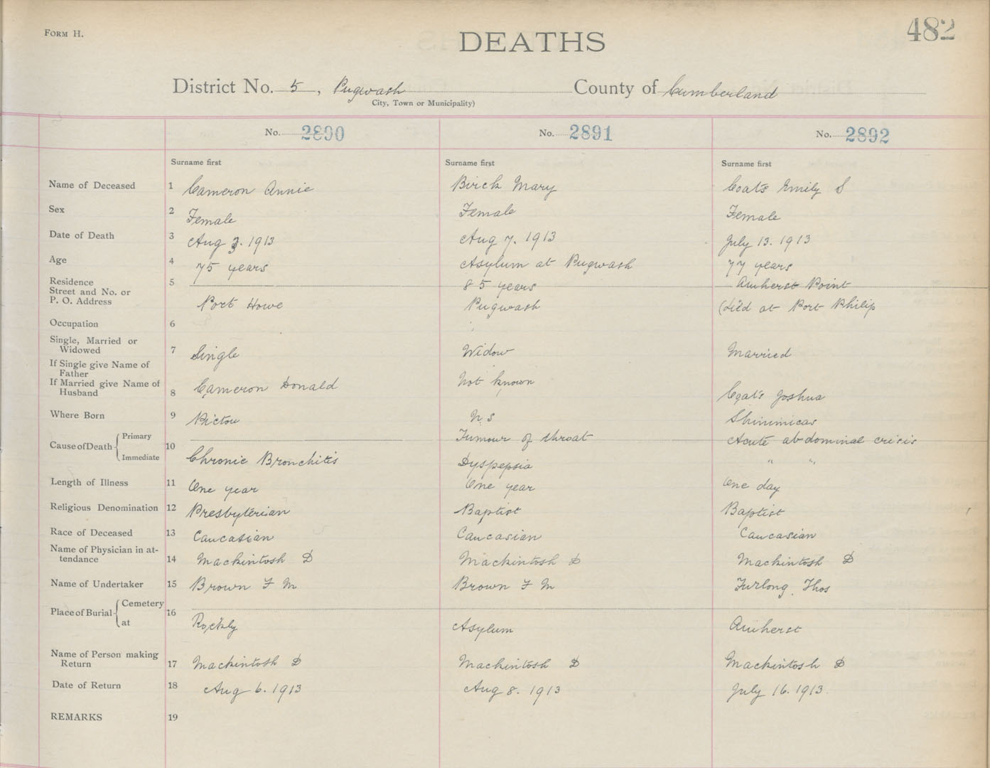 Death Registration: Year: 1913 book: 5 page: 482 number: 2892