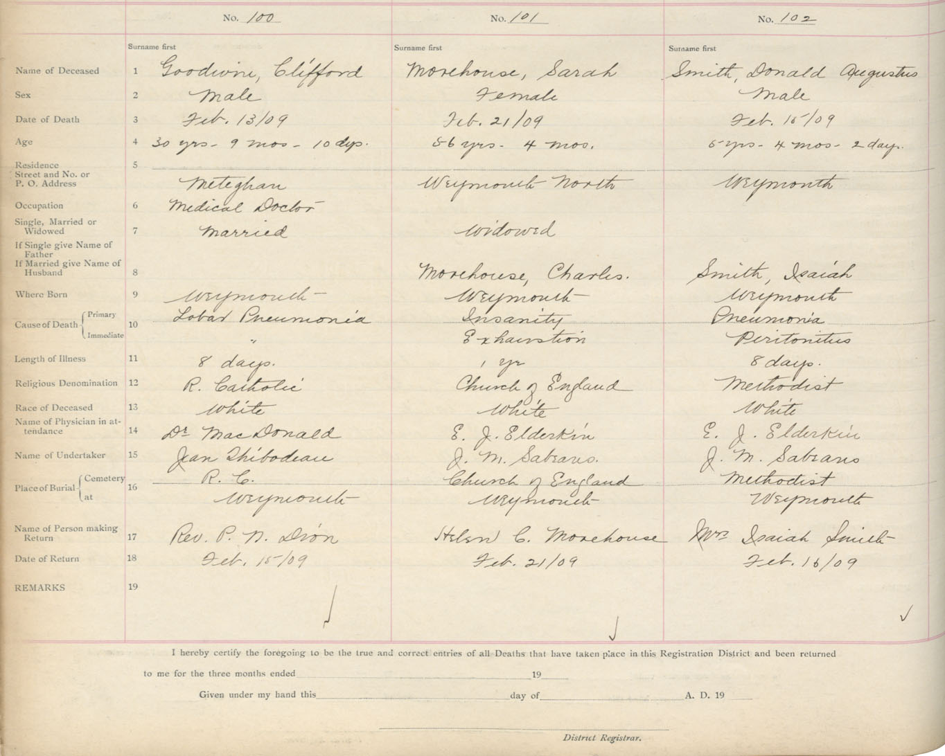 Death Registration: Year: 1909 book: 6 page: 17 number: 100