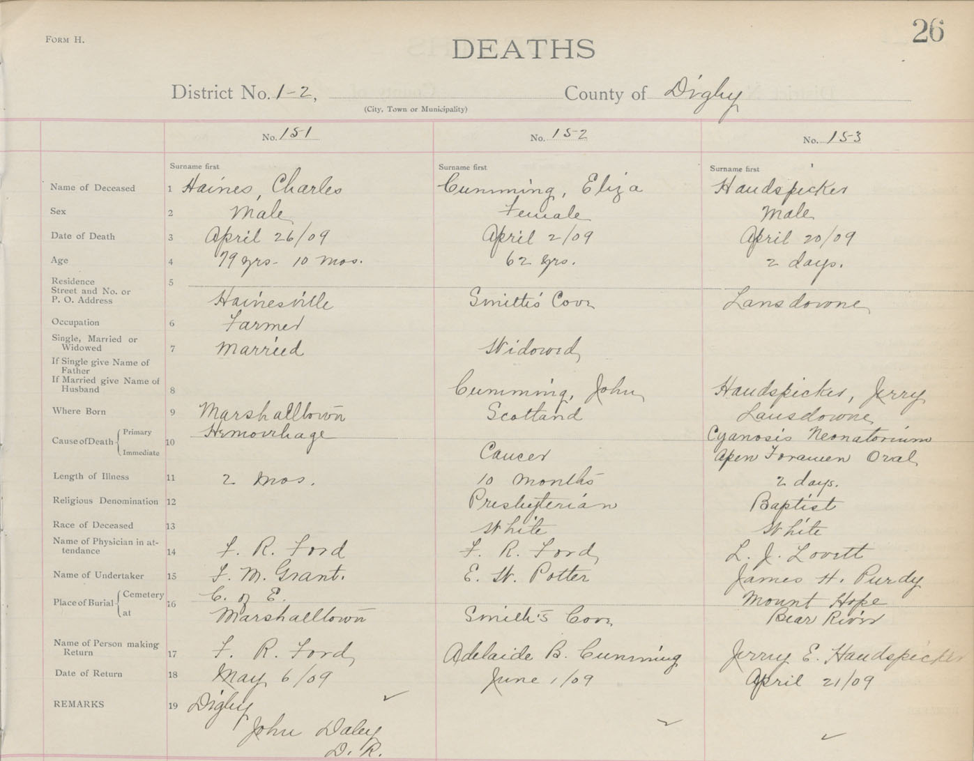 Death Registration: Year: 1909 book: 6 page: 26 number: 153