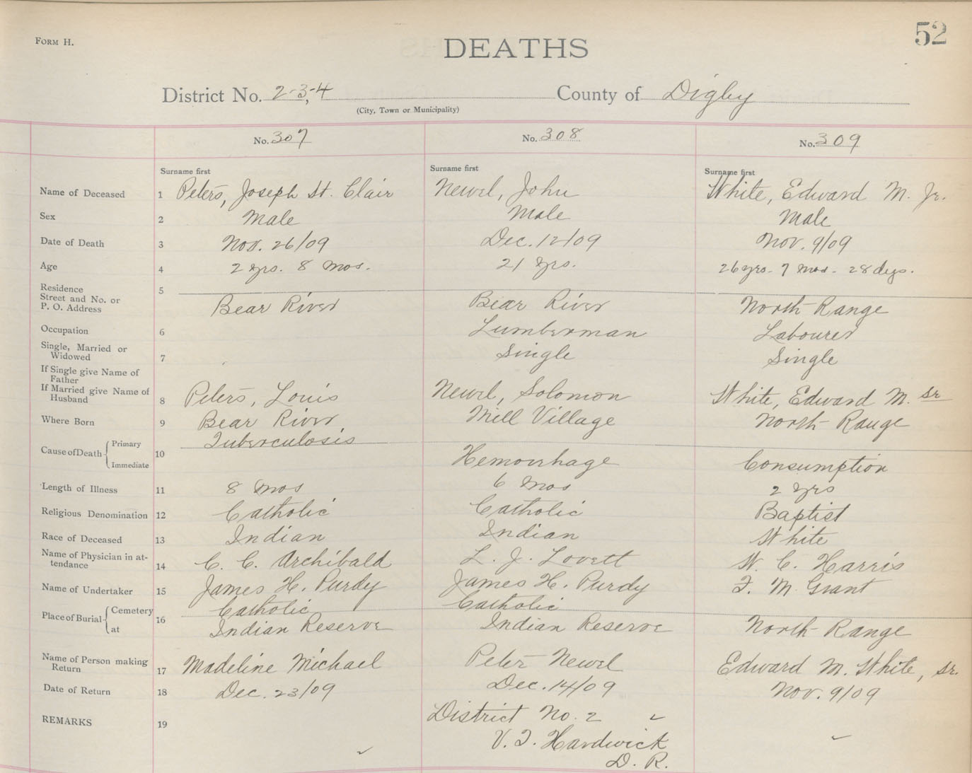 Death Registration: Year: 1909 book: 6 page: 52 number: 307