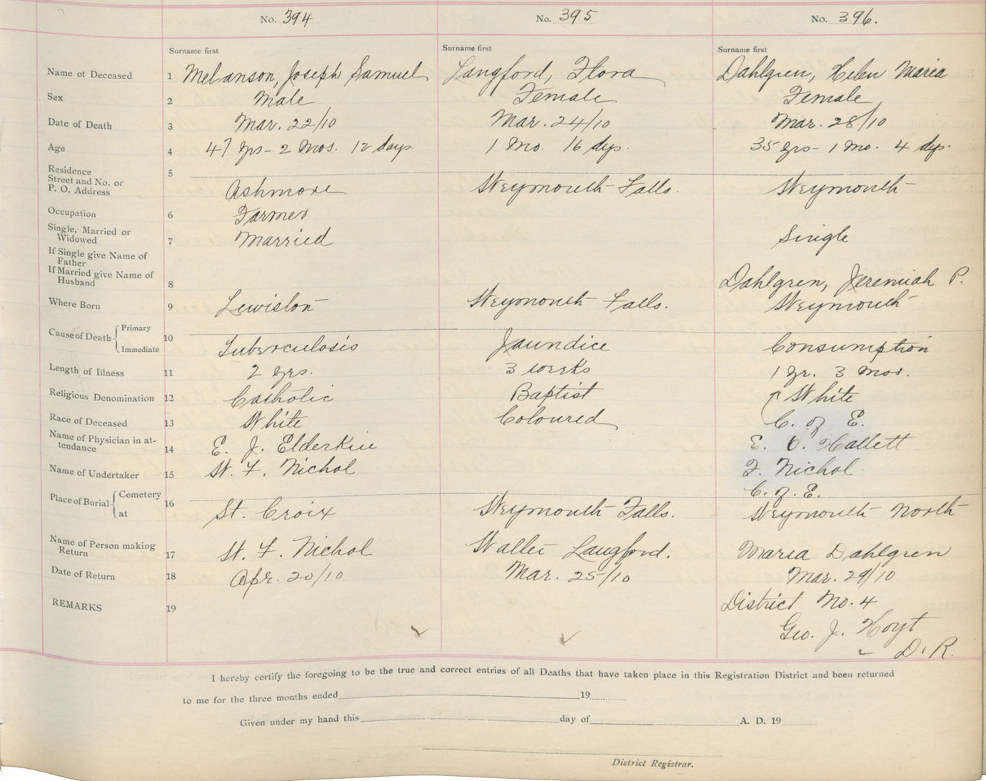 Death Registration: Year: 1910 book: 6 page: 66 number: 394