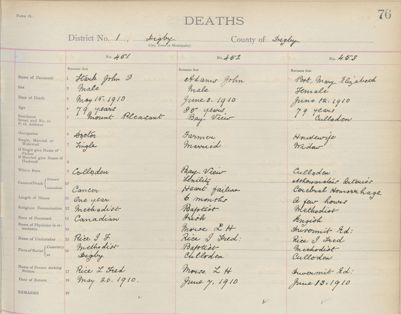 Death Registration: Year: 1910 book: 6 page: 76 number: 451