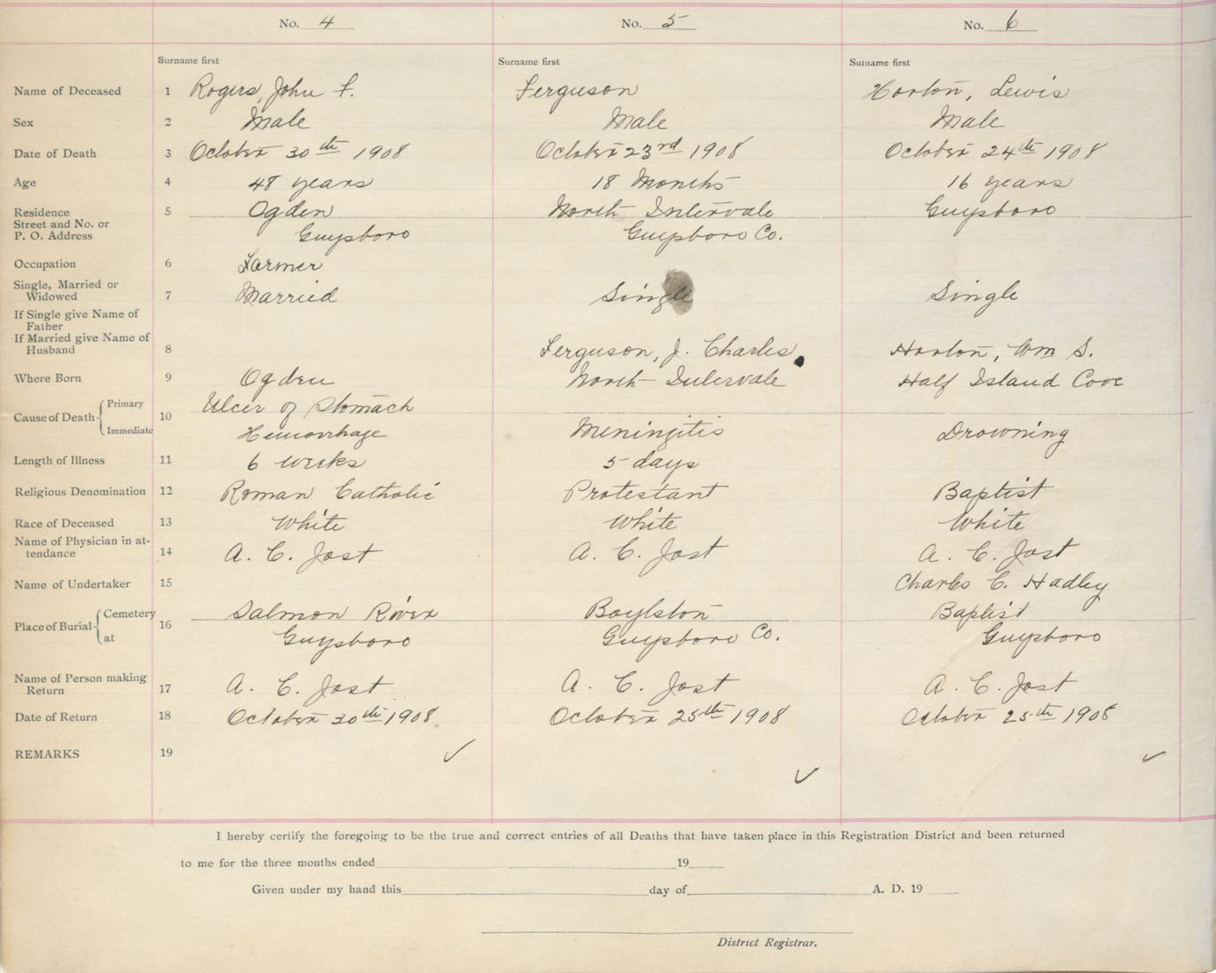 Death Registration: Year: 1908 book: 7 page: 1 number: 6